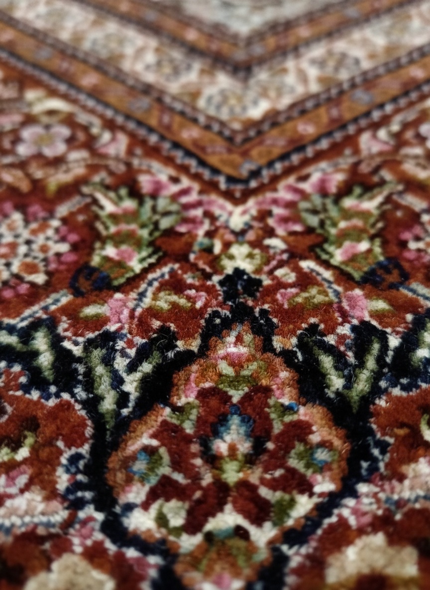 • در حالی که برخی فرشهای دیگر مثل قم یا نایین به دلیل استفاده گسترده از ابریشم، ظاهری بسیار براق و درخشان دارند.