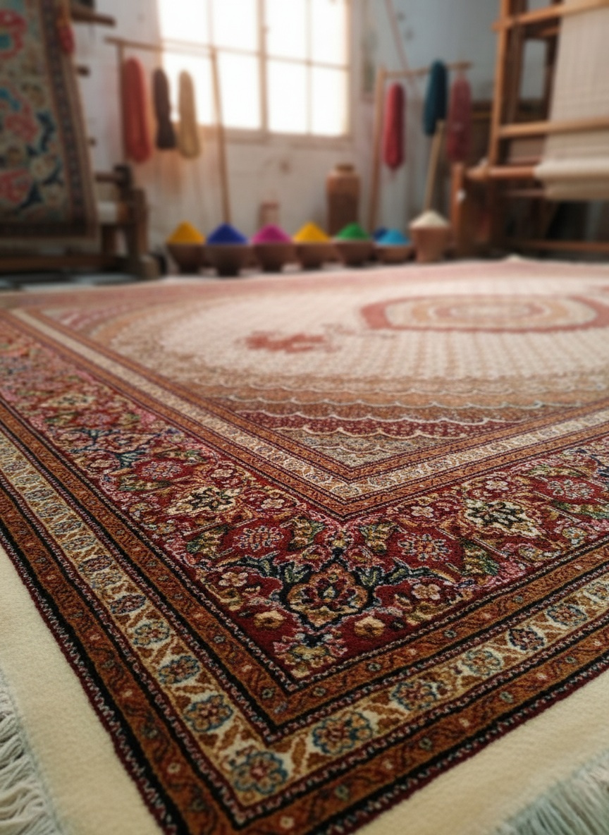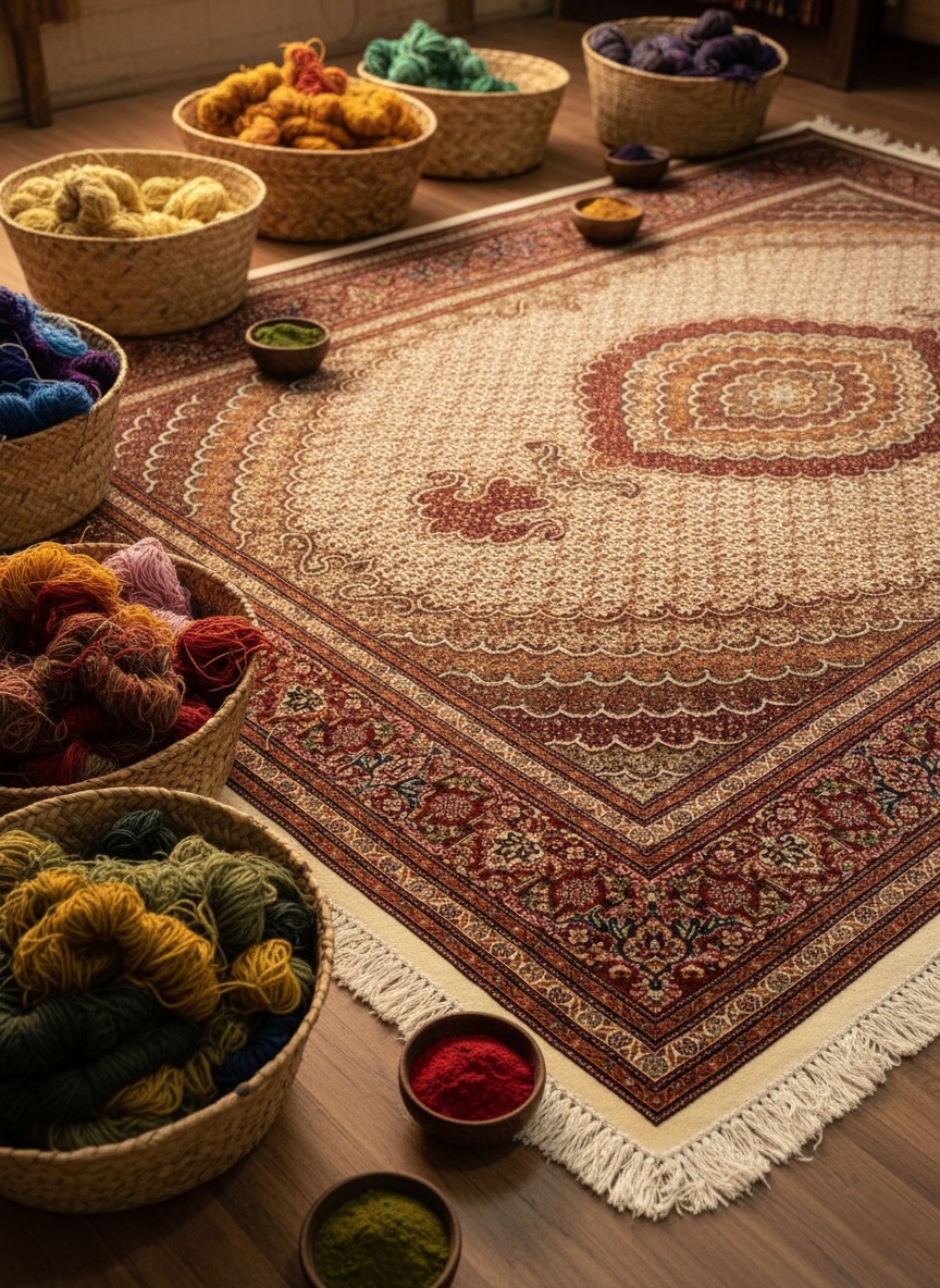 • در مقابل، فرشهای قم یا کاشان بیشتر از رنگهای روشن مثل فیروزهای، صورتی و عاجی بهره میبرند.